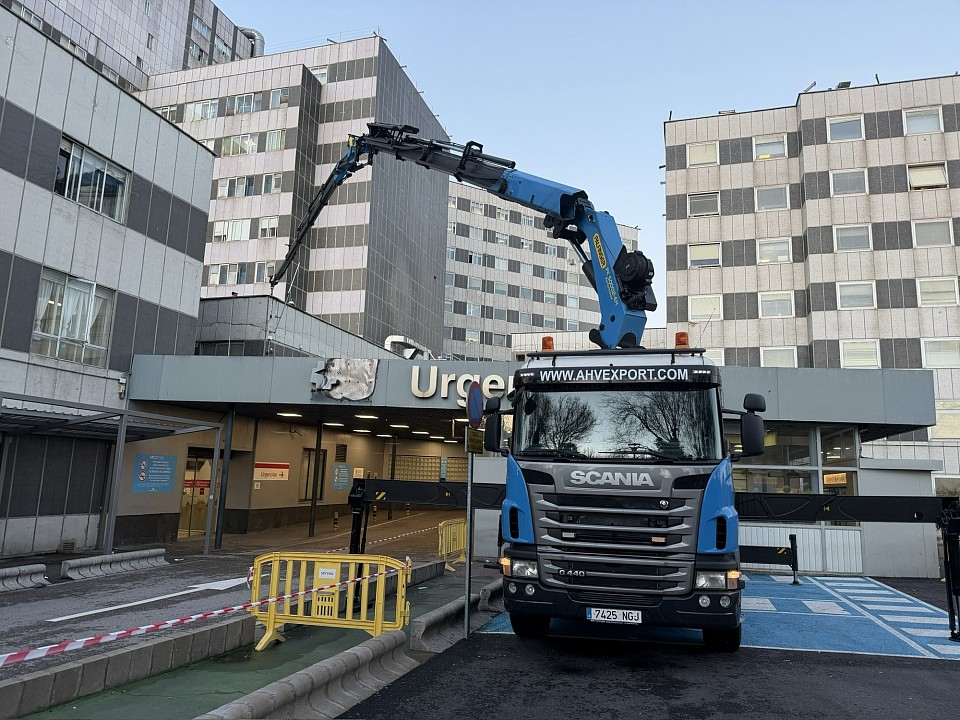 Conjunto de tractora grúa y semirremolque góndola que permite la carga de maquinaria y mercancías con un volumen de 3 metros de anchura, por 3,5 m de altura por 9 metros de largo.